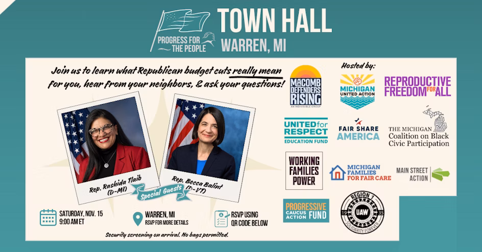 Join us to learn what Republican policies mean for you, hear from your neighbors, and ask your questions! National progressive leaders will join local advocates and union members in Warren, Michigan for a community town hall highlighting the impacts of the government shutdown and recently passed Republican budget law — and presenting a more just, equitable vision for the nation. With special guests U.S. Representative Tlaib & U.S. Representative Balint.