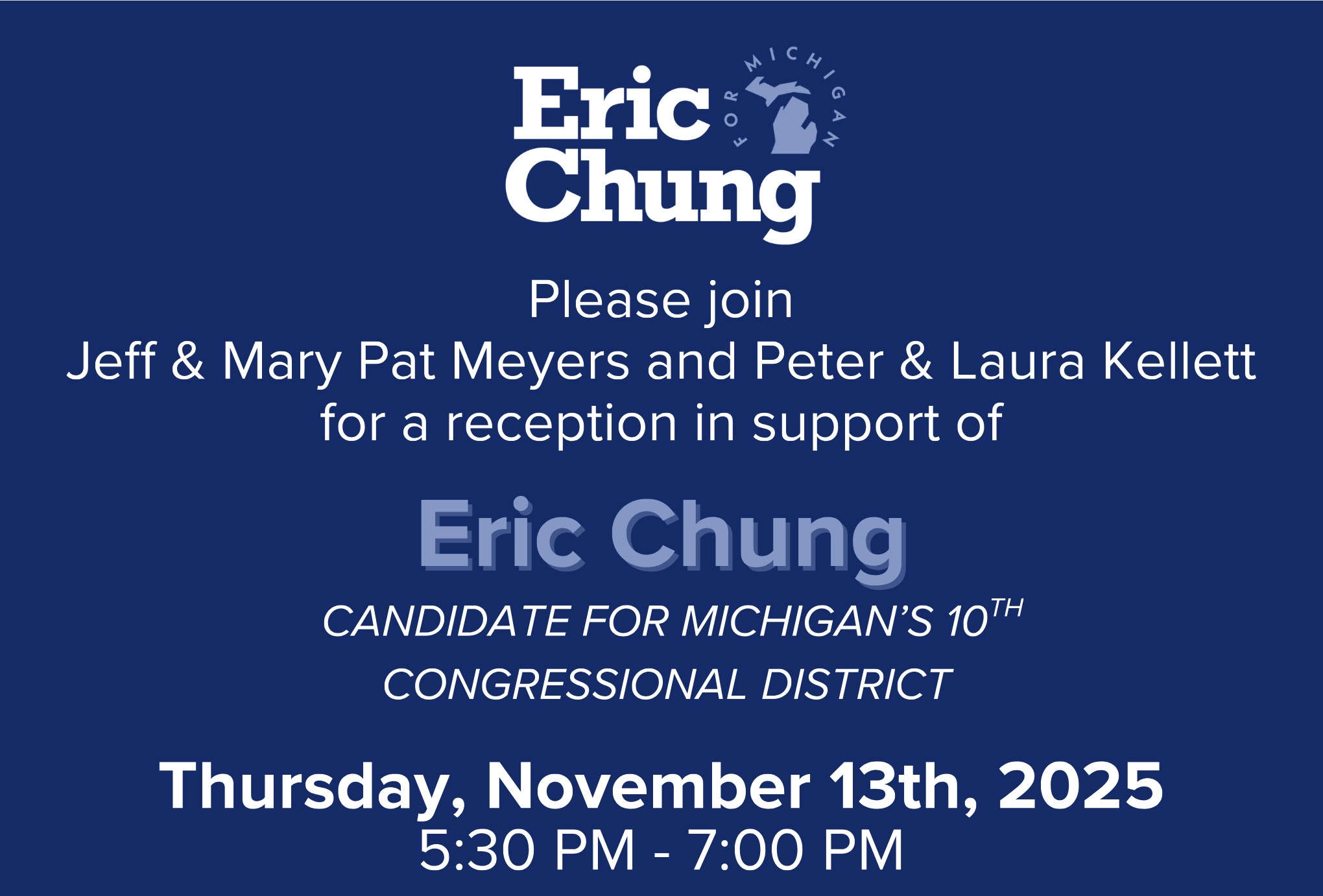 Please join Jeff & Mary Pat Meyers and Peter & Laura Kellett for an event in support of Eric Chung, candidate for Michigan’s 10th Congressional District! Eric is running to flip Michigan’s 10th congressional district, one of the critical swing districts to flip the House of Representatives.
