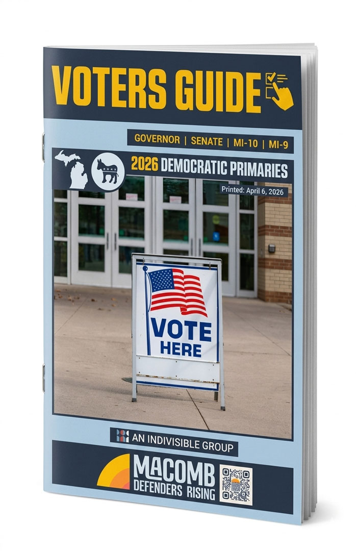 Each policy position on the Voters Guide is rated as Pass, Mixed, or Fail based on how well it aligns with the values and priorities of Macomb Defenders Rising. These ratings are editorial judgments made by our team using the research and candidate responses described below. A ‘Pass’ indicates strong alignment, a ‘Fail’ indicates a clear conflict, and a ‘Mixed’ rating reflects partial alignment, insufficient detail, or a position that warrants further context.